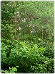 いったいコレは樹齢何年なんだ、とゆーよーな、4〜5階建てのビルくらいの高さもある巨木が集団で生い茂ってまして、下には自然の小川が流れていたりします。雨の降った翌日ともなると、この小川にさらさらさららららら〜と天然の水音が涼しげに流れ、そこにピーひょろろろろろろ、とかっていろんな鳥の楽しげな声が聞こえて来たりするのでした。ちなみに、春にはもちろんウグイスがイヤというほど鳴いてくれます。