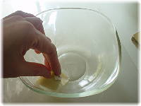 4.にんにくをスライスし、ボールにこすりつけるようにして風味をつける。