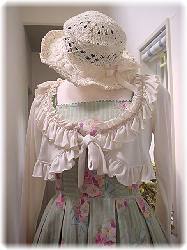 後ろは水玉リボンで編み上げに結ぶようになっていて、このあたりのディテールもロリータなお洋服では人気の定番って感じですね。それに帽子と似た色合いのメアリさんのニットボレロを合わせています。こういうコーデには、ふつうカゴバッグを合わせて持ちます。