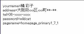 上の例では、スクリプトは以下のようになっています。合わせてご覧下さい。 <FORM> <p>お名前: <INPUT TYPE="text" NAME="yourname" SIZE="15" MAXLENGTH="20" ></p> <p>ご住所: <INPUT TYPE="text" NAME="address" SIZE="50" VALUE="最大100文字まで入力できます。" MAXLENGTH="100" ></p> <p>電話番号: <INPUT TYPE="text" NAME="tel" SIZE="20" MAXLENGTH="20" ></p> <p>パスワード: <INPUT TYPE="password" NAME="pw" SIZE="10" VALUE="***" MAXLENGTH="10" ></p> <p><INPUT TYPE="hidden" NAME="pagename" VALUE="homepage_primary1_7_1"></p> </FORM> ★送信例★