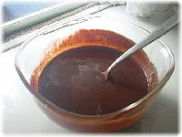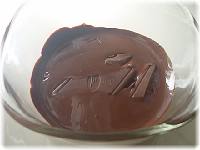 17.コーティング用のチョコレートを作ります。チョコレートと無塩バターを合わせて溶かすわけですが、普通はこれも湯せんにかけます。でも、やはりめんどいので、私はケーキが焼き上がった後のオーブンの予熱を利用しています。オーブンの火が止まっているのを確認してから、バターとチョコを金属製のナベに入れてしばらくオーブン内に放置しておくと簡単に溶けます。要は溶ければ良いわけなので、電子レンジで加熱しても構わないでしょう。 溶けたらオーブンから出して、よく混ぜ合わせます。予熱で溶かす場合に使うナベは、持ち手部分が木製か金属製のものを使うのが無難。予熱と言ってもけっこう熱いので、材質によっては耐熱範囲を超えてしまうことがあるかもしれません。